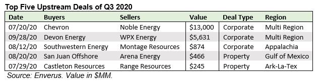 The largest deal of the third quarter was Chevron’s $13 billion acquisition of Noble Energy, which targeted assets in the DJ and Permian basins, as well as Eastern Mediterranean gas production. While a fraction of the cost of Chevron’s attempted Anadarko acquisition last year, its purchase of Noble is still tied for the fourth largest global upstream deal since 2014.
