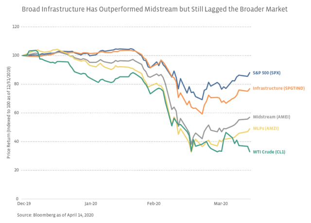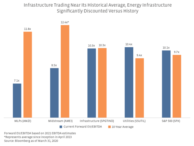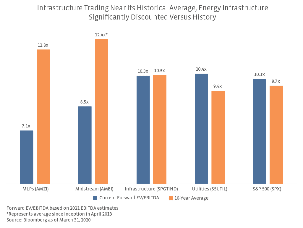 In the context of the recent downturn, it is useful to consider the valuation of infrastructure versus midstream. As of the end of March, infrastructure was trading nearly in line with its ten-year average forward EV/EBITDA multiple compared to significant discounts for MLPs and midstream (see chart below). Similarly, the S&P 500 and Utilities were trading at a premium relative to history. Given recent performance for energy infrastructure, valuation metrics are heavily discounted compared to historical averages.