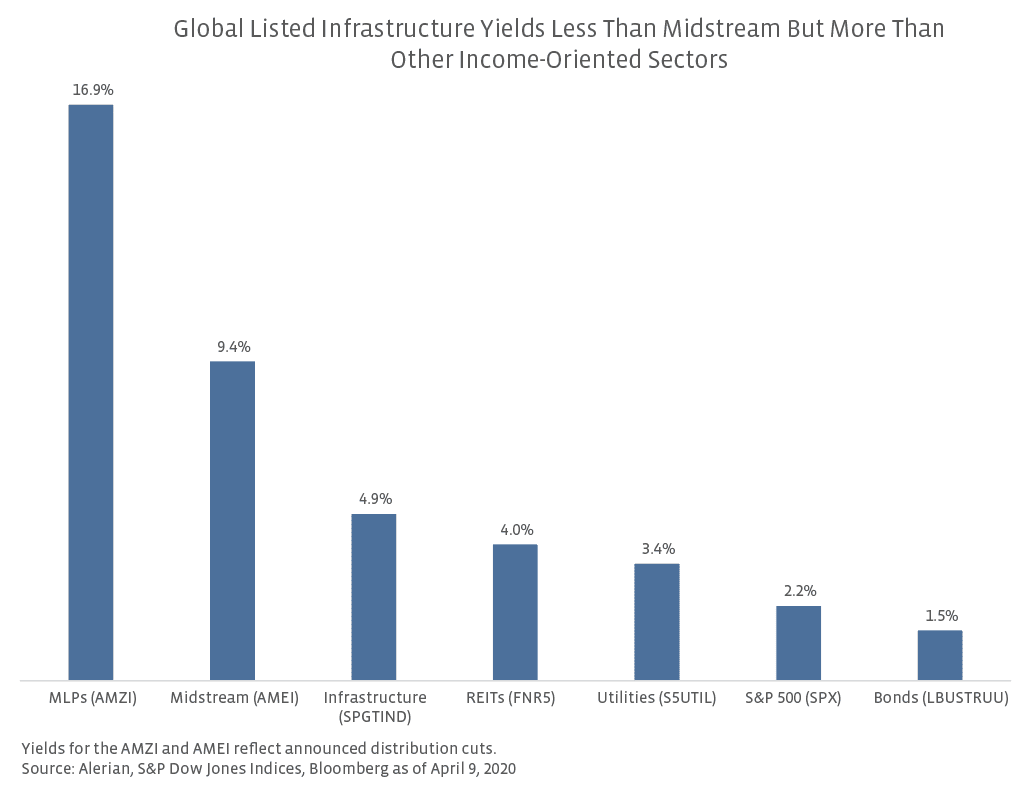 At a high level, investors often think of midstream assets as the steel in the ground needed to move hydrocarbons across the US. The global listed infrastructure space has similar appeal in this regard as the real assets that provide essential services to support both the economy and everyday lives. In addition to energy-related assets, the broader global listed infrastructure sector comprises publicly listed companies with assets and activities in the Utilities, Industrials, Communications, Transportation, and Social sectors. Electricity transmission and distribution, energy infrastructure (such as pipelines), wireless towers, toll roads, and correctional facilities are just a few examples of what is included within global listed infrastructure. The listed infrastructure universe market cap totaled an estimated $1.8 trillion at the end of 2019, with the North American energy infrastructure universe market cap at $575 billion as of year-end 2019 for comparison. In this piece, the data for the global listed infrastructure space will be represented by the S&P Global Infrastructure Index (SPGTIND), which is categorized broadly as about half Utilities, one-third Industrials, and roughly 17% Energy by weighting as of March 31 with an average constituent market capitalization of $16.3 billion.