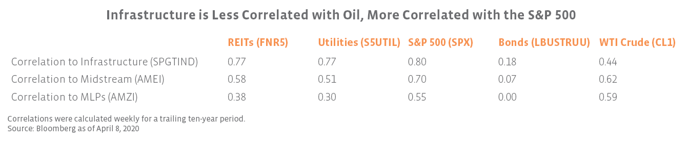 The impact of simultaneous supply and demand shocks for oil has sent midstream performance down significantly to start this year. Global listed infrastructure (SPGTIND) has not been free from the negative demand consequences of the coronavirus, dropping nearly 25% year to date through April 13 on a price-return basis compared to -14.5% for the S&P 500 (SPX). However, as shown in the chart below, listed infrastructure has come in ahead of its midstream energy counterparts, with the Alerian MLP Infrastructure Index (AMZI) and Alerian Midstream Energy Select Index (AMEI) declining by 53.0% and 44.3%, respectively, tracking closer to the fall in oil prices. While energy infrastructure has been pressured, utilities have performed defensively, with the S&P 500 Utilities Index (S5UTIL) down only 8.9% through April 13. Infrastructure has benefited from inclusion of utilities and diversification given mixed performance among its various sectors.