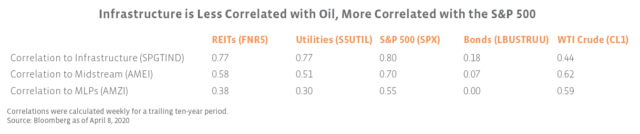 Given the overlap between infrastructure and energy infrastructure, one would expect a significant correlation between infrastructure and MLPs and midstream. The ten-year correlation between infrastructure and MLPs was 0.58, while the ten-year correlation with midstream was higher at 0.78.